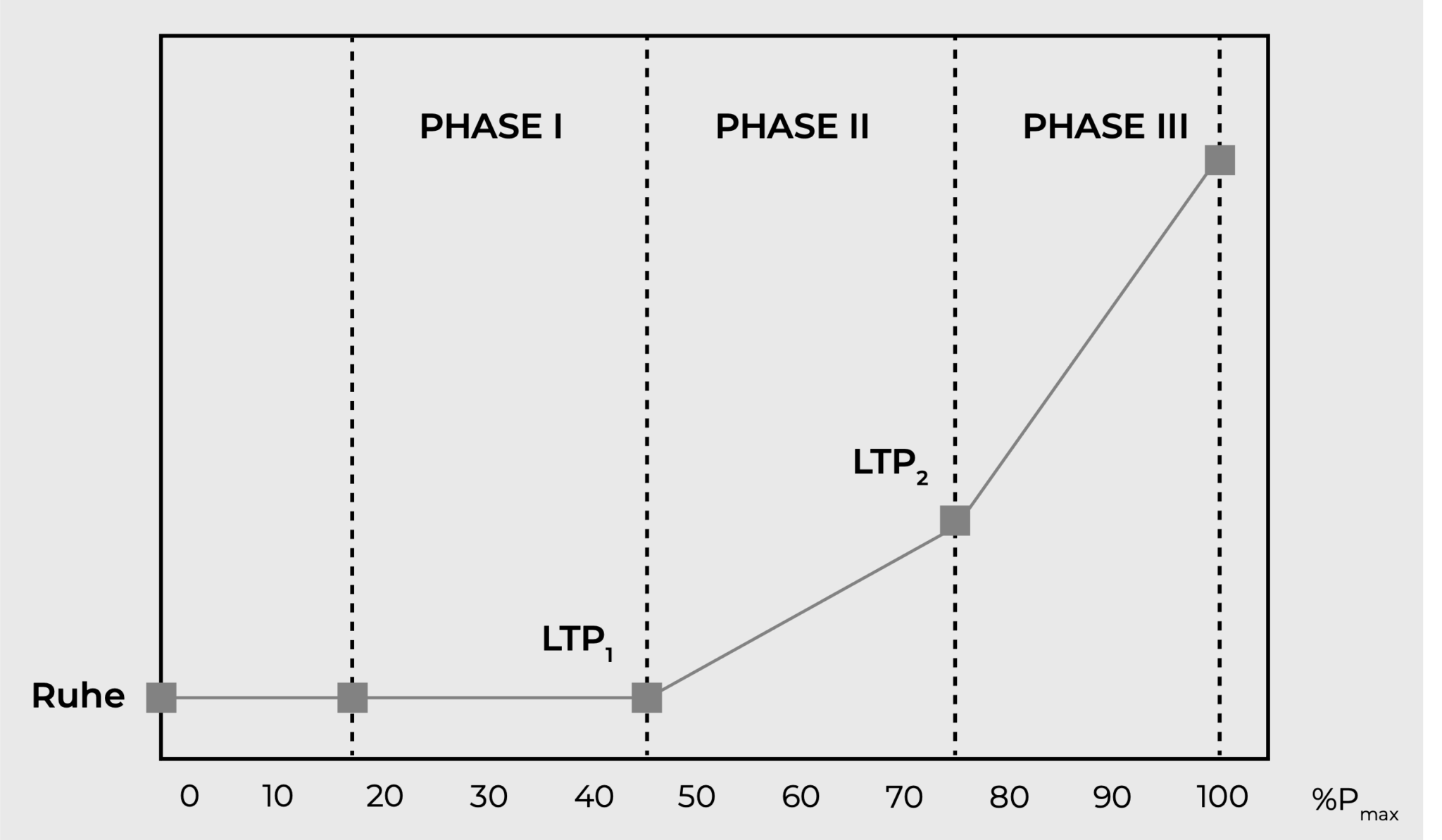 In modern performance diagnostics, sub-maximal and maximal markers of performance are the basis of individual training control. These markers are determined by the behaviour of physiological parameters during stress tests. The physiological parameters recorded in such step or ramp tests show a three-phase progression. The so-called three-phase concept is considered the current scientific standard (Binder et al., 2008; Mezzani 2017; Wonisch et al., 2017):
